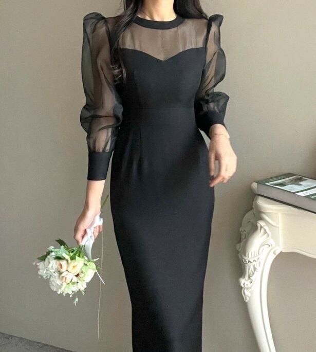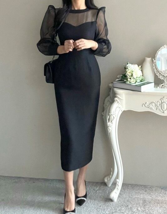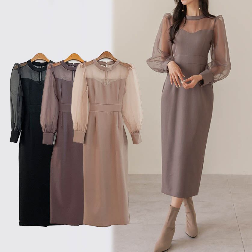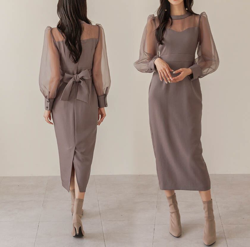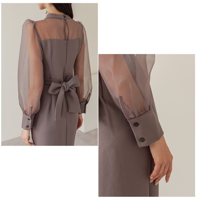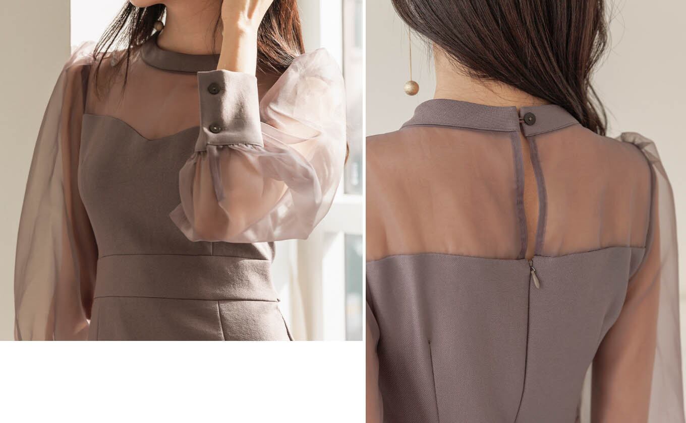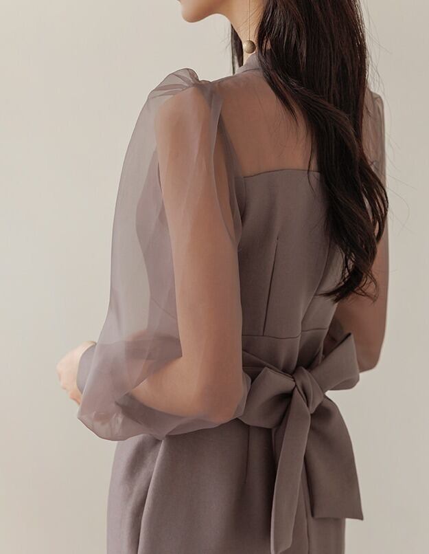 袖シースルー パフスリーブ バックリボン Hライン ワンピース◆ シアー ワンピース W7188